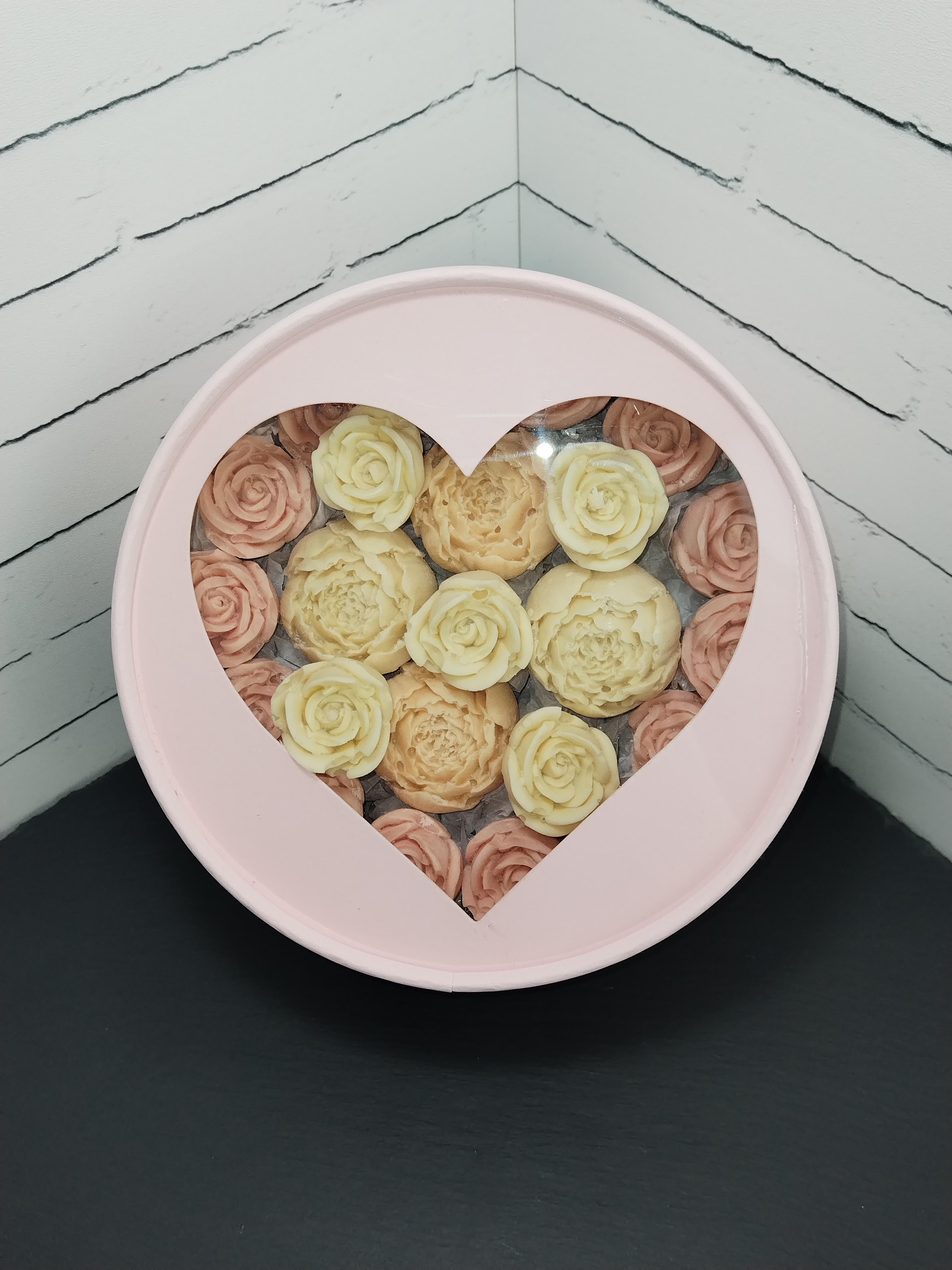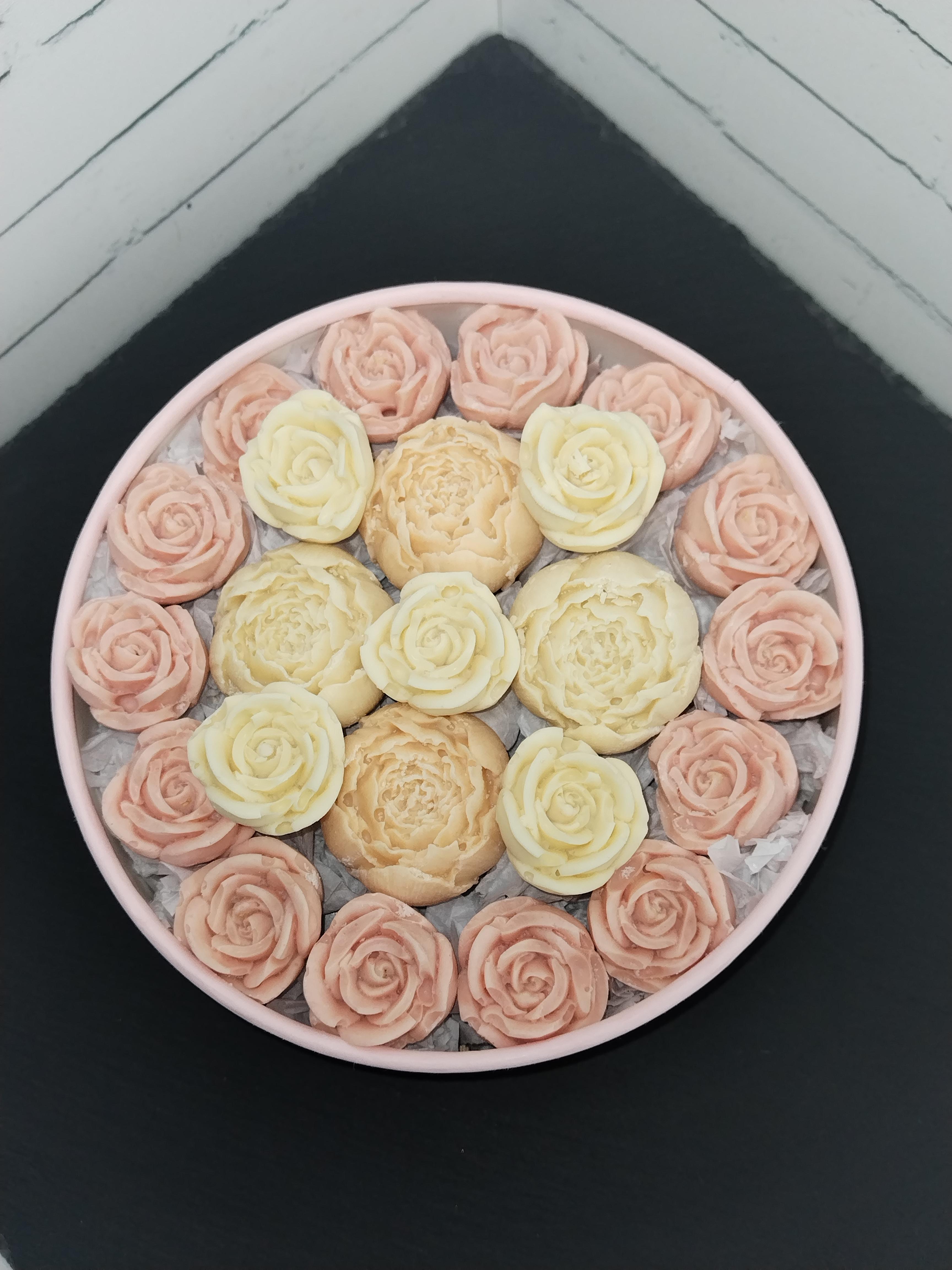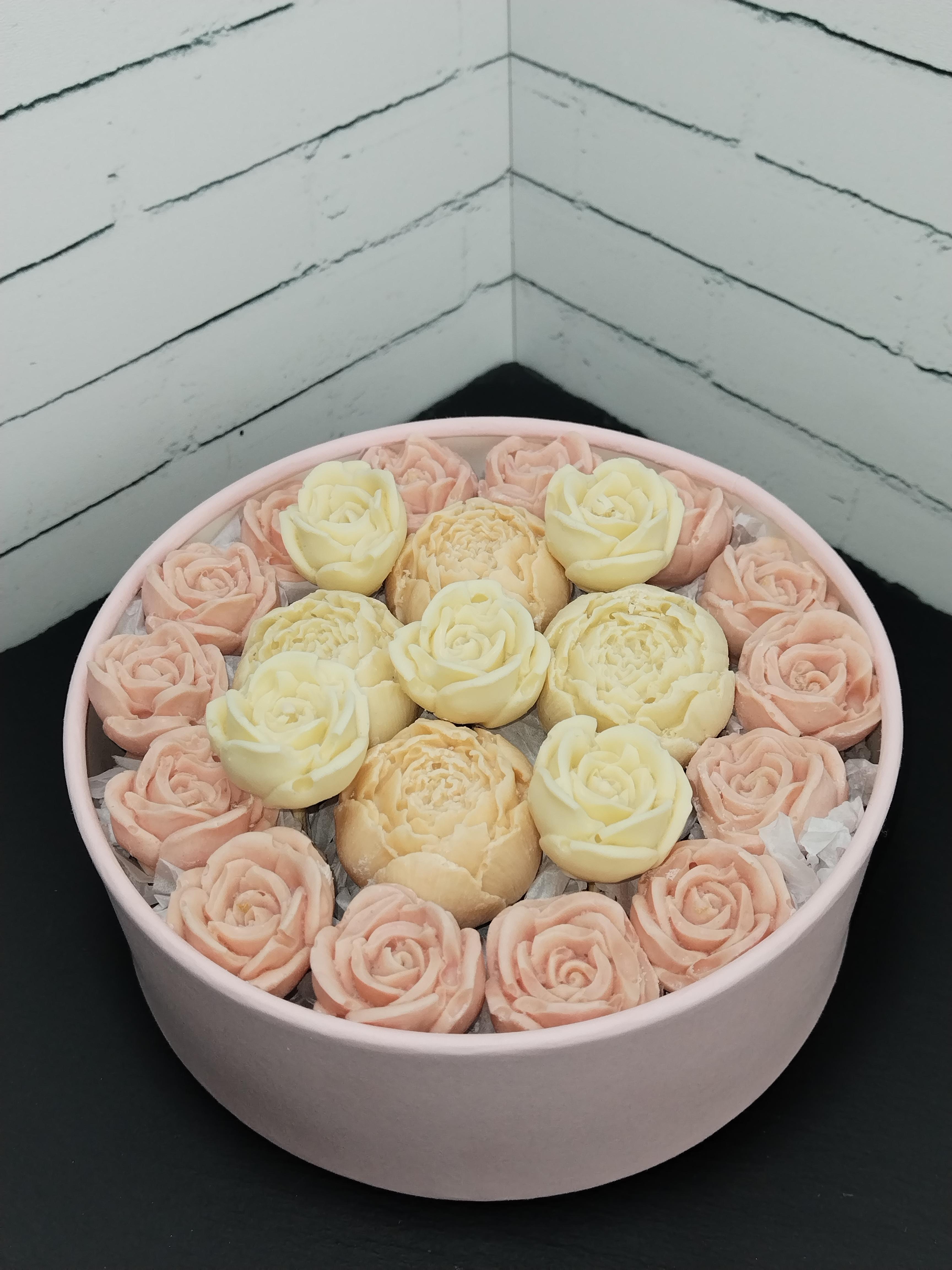 Коробочка из шоколадных цветов сделанных из шоколада Barry Callebaut с добавлением холвы пишмания, фисташка, малина, апельсин. Вес 410 грамм.