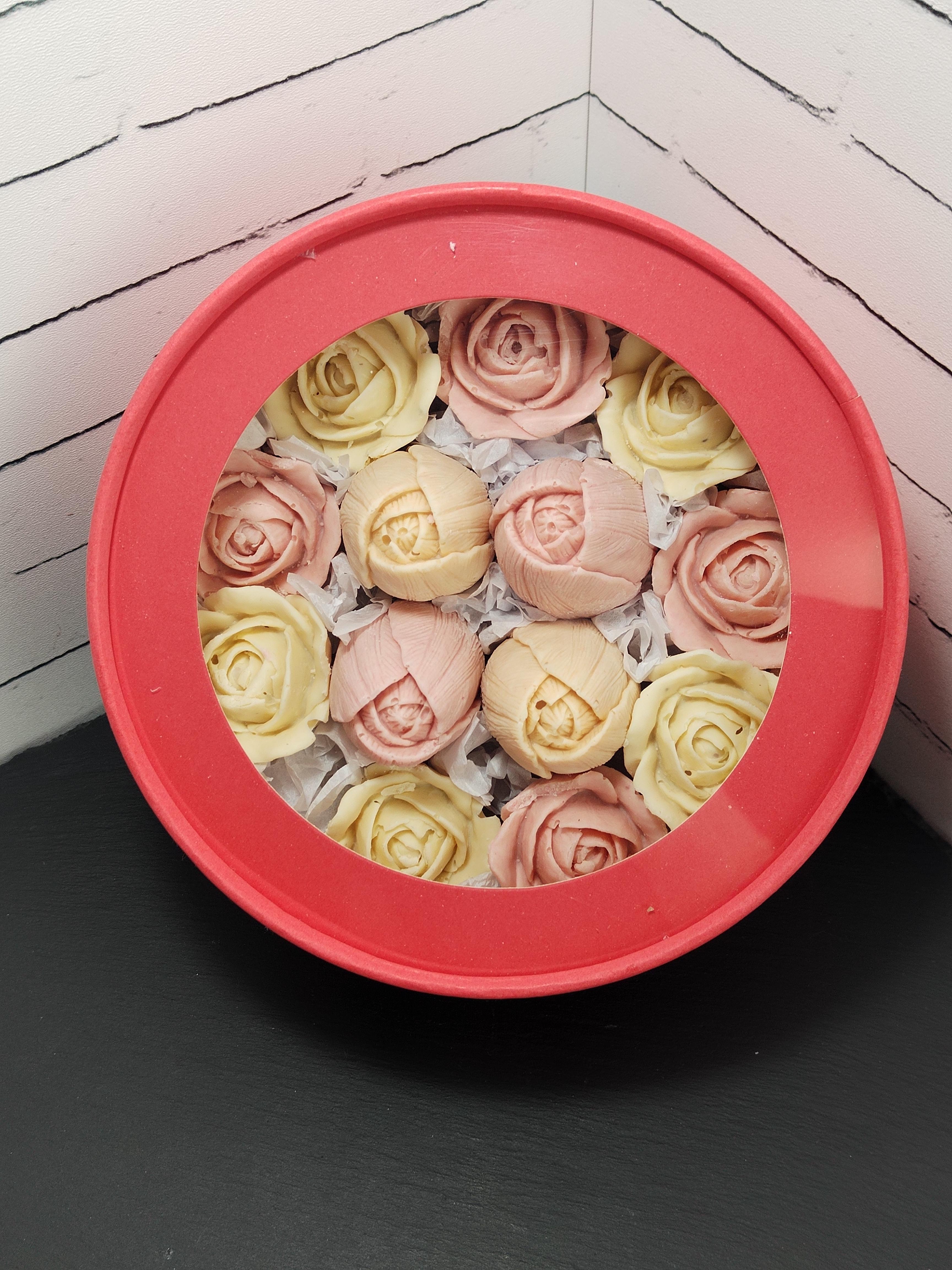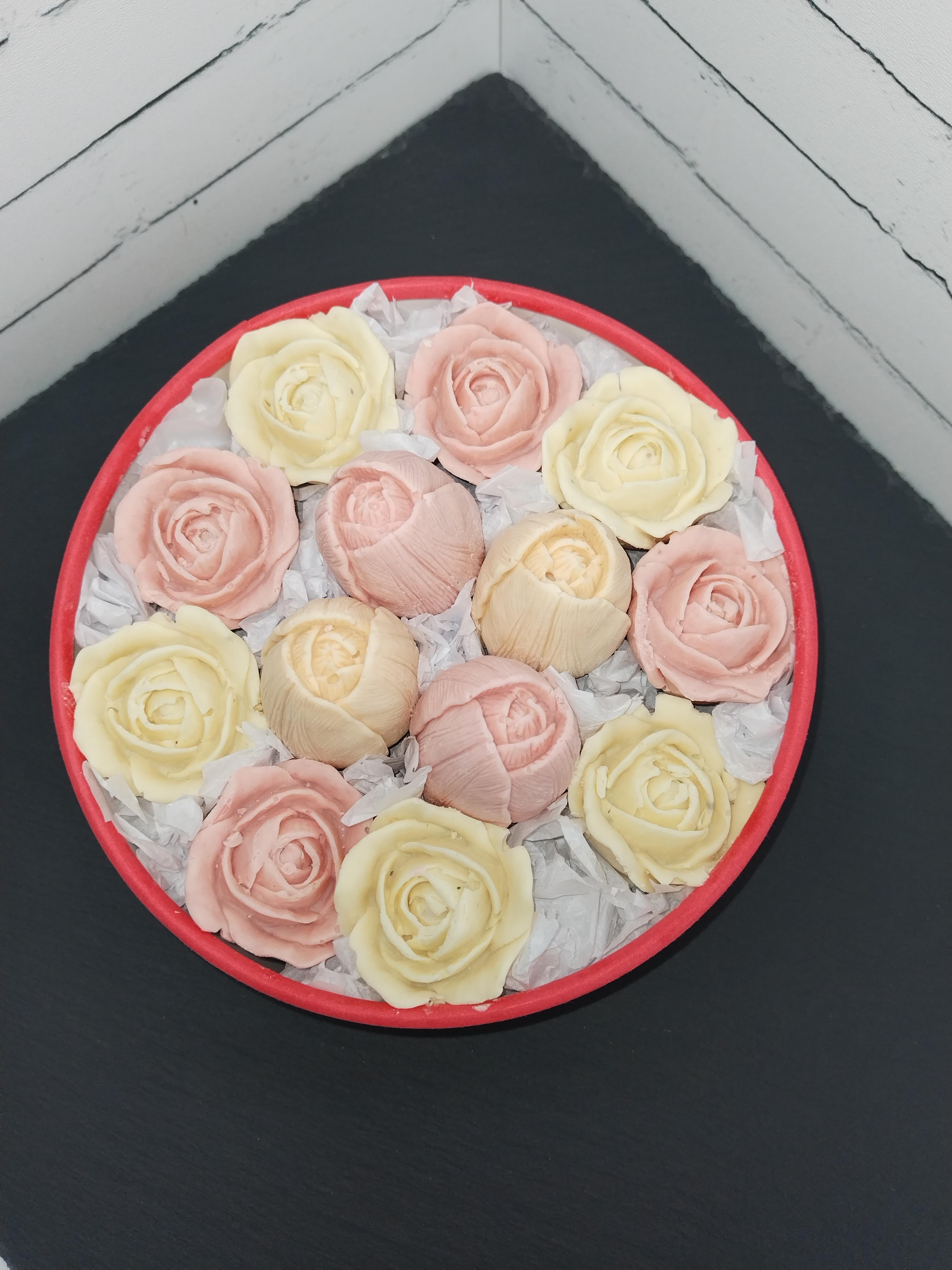 Коробочка из цветов сделанных из шоколада Barry Callebaut с добавлением халвы пишмания, фисташка,малина,апельсин. Вес380 грамм.