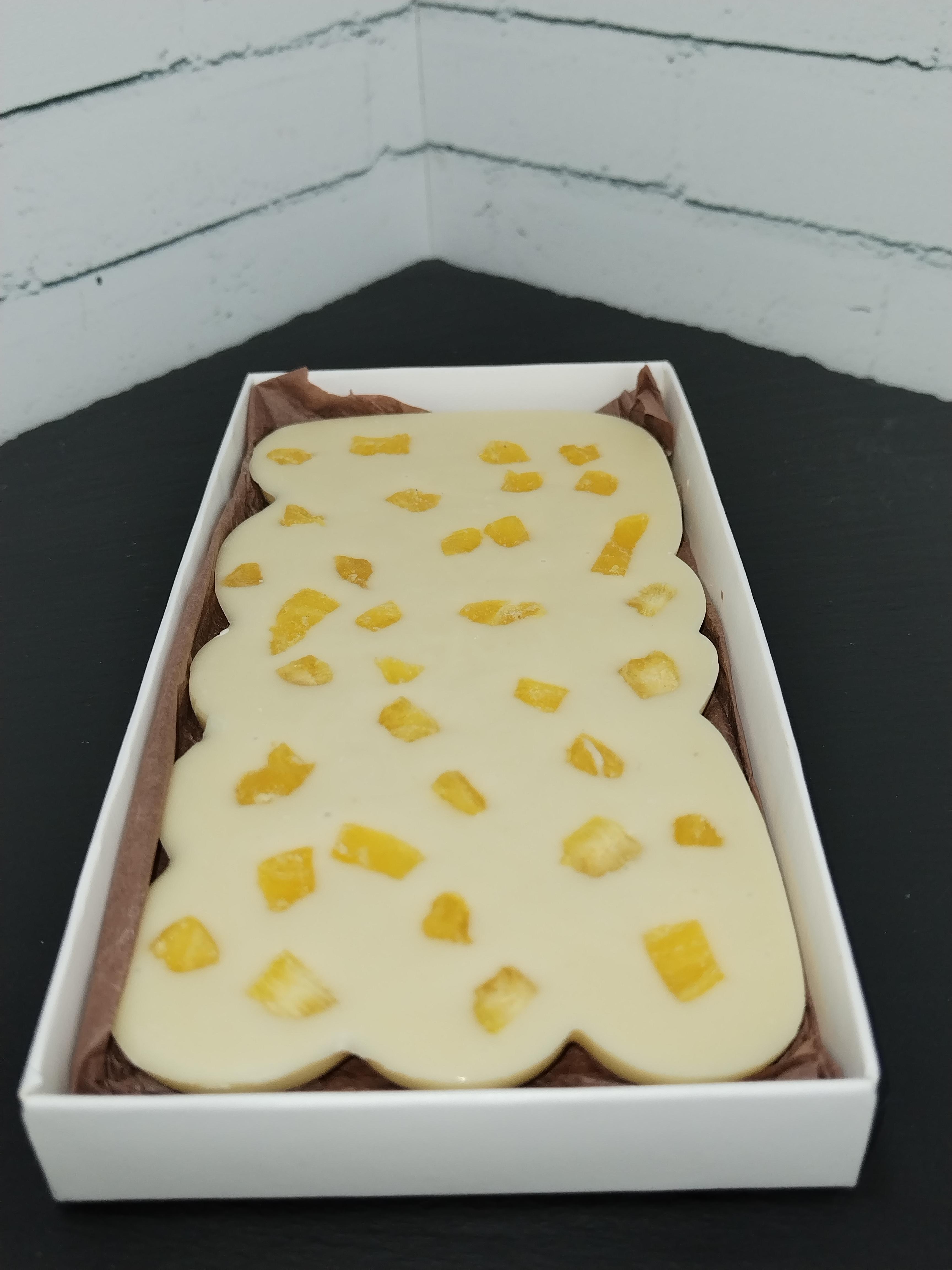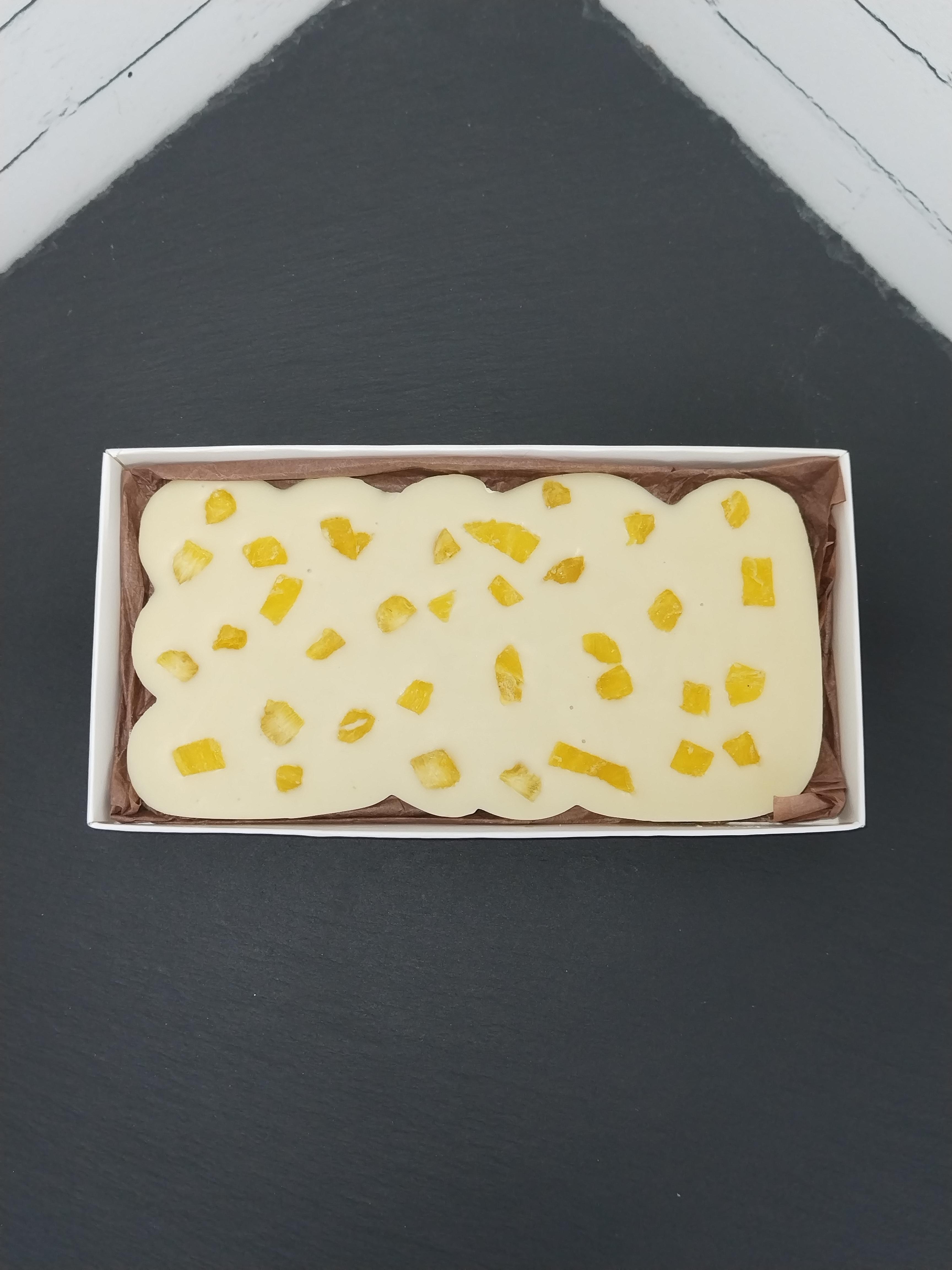 Плитка из белого бельгийского шоколада без сахара с добавлением сушёного ананаса. Вес 100 грамм