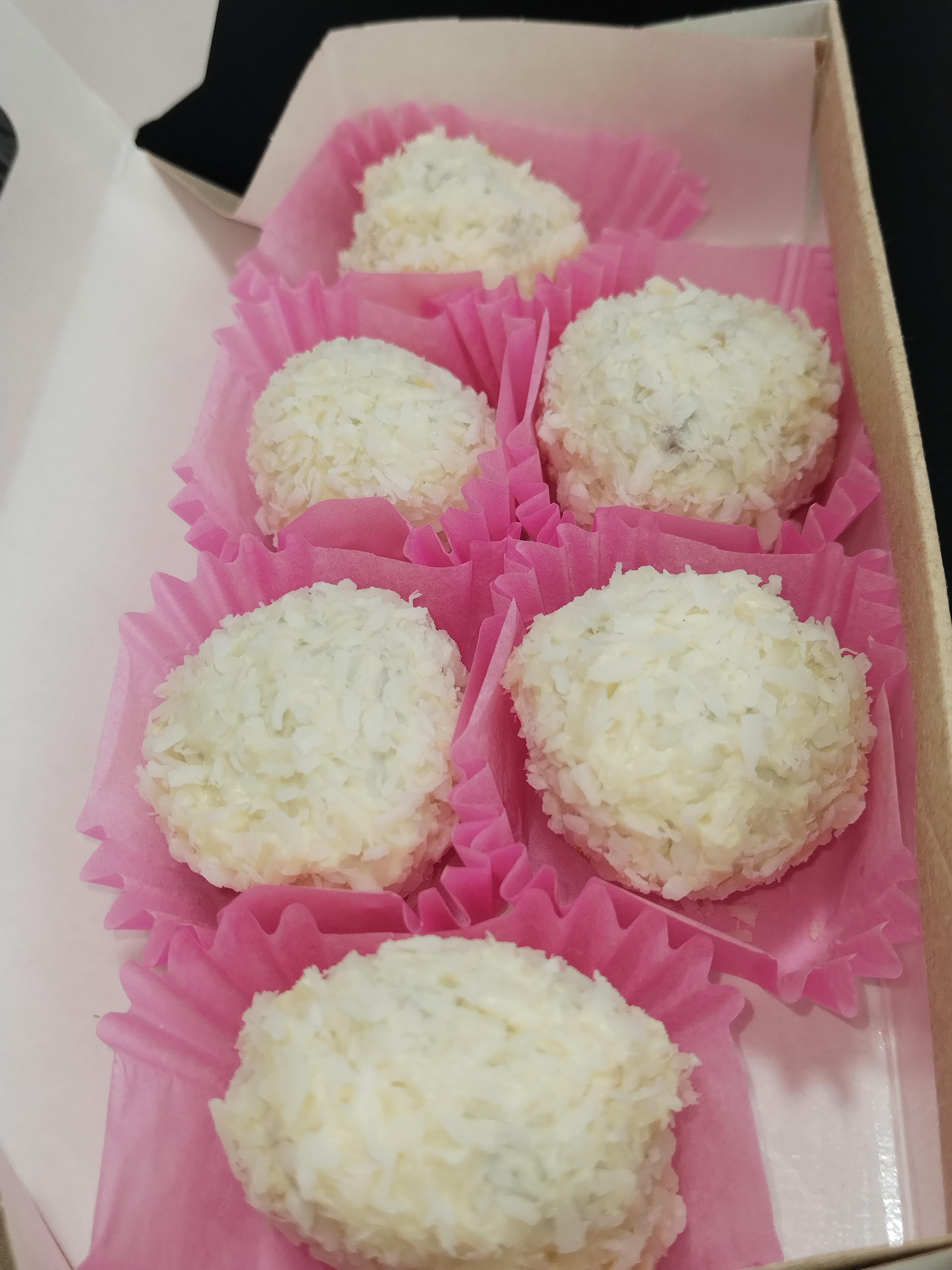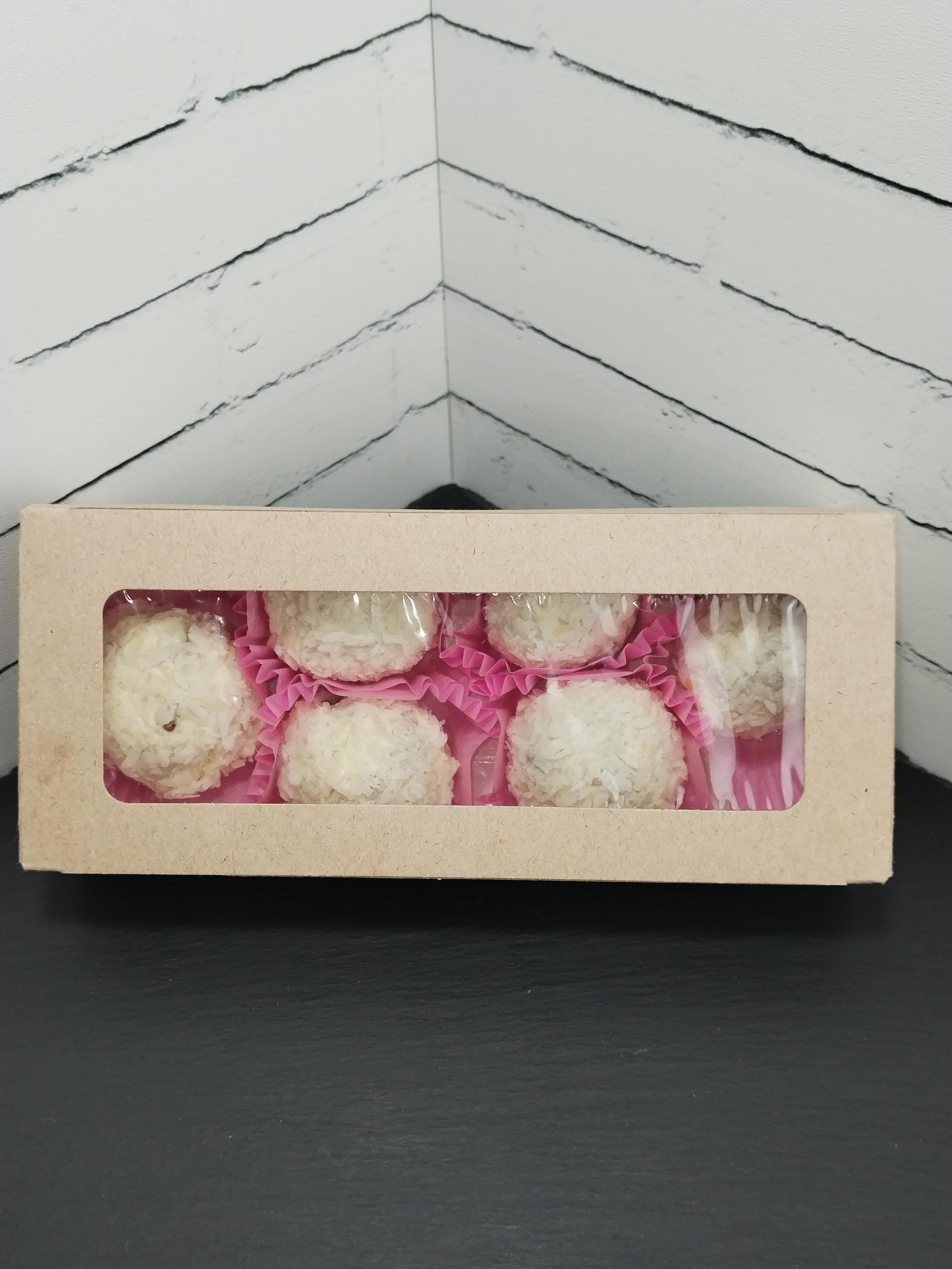 Трюфели. Ганаш из молочного шоколада, корпус из белого шоколада, обсыпка кокосовая, стружка. Вес 180 грамм.
