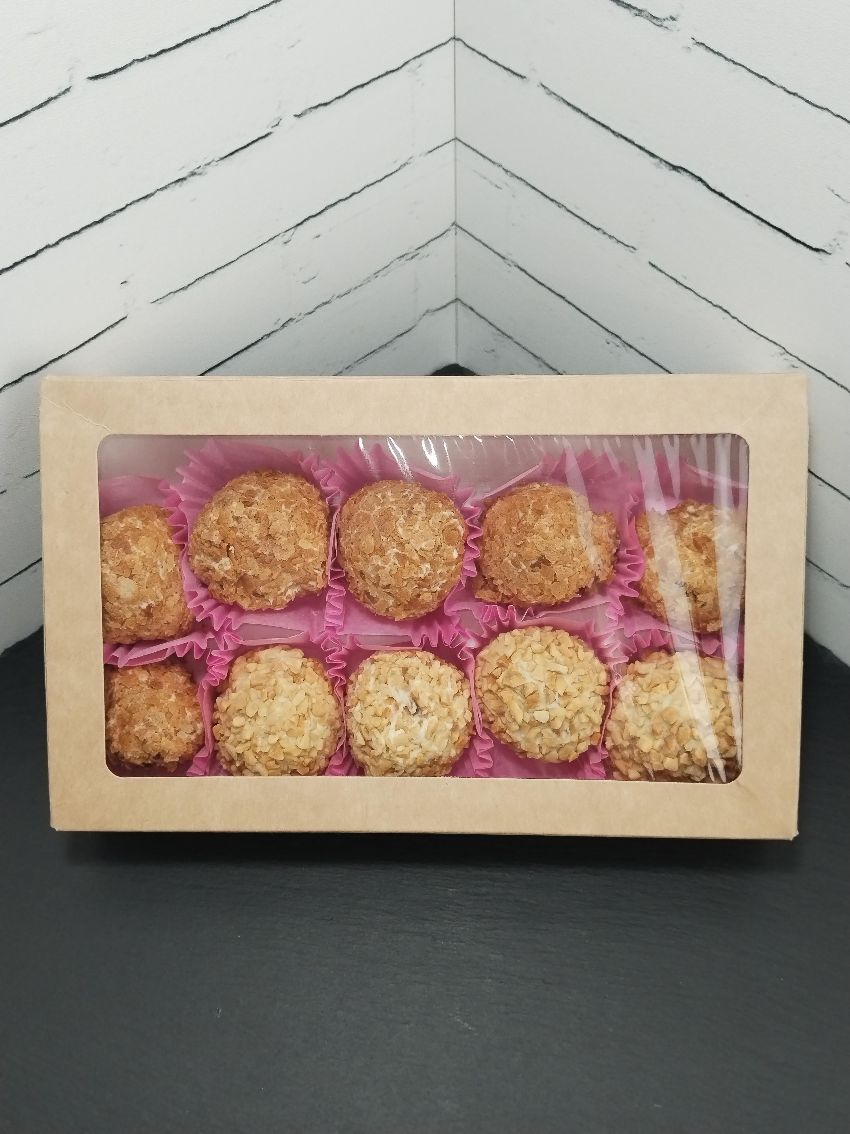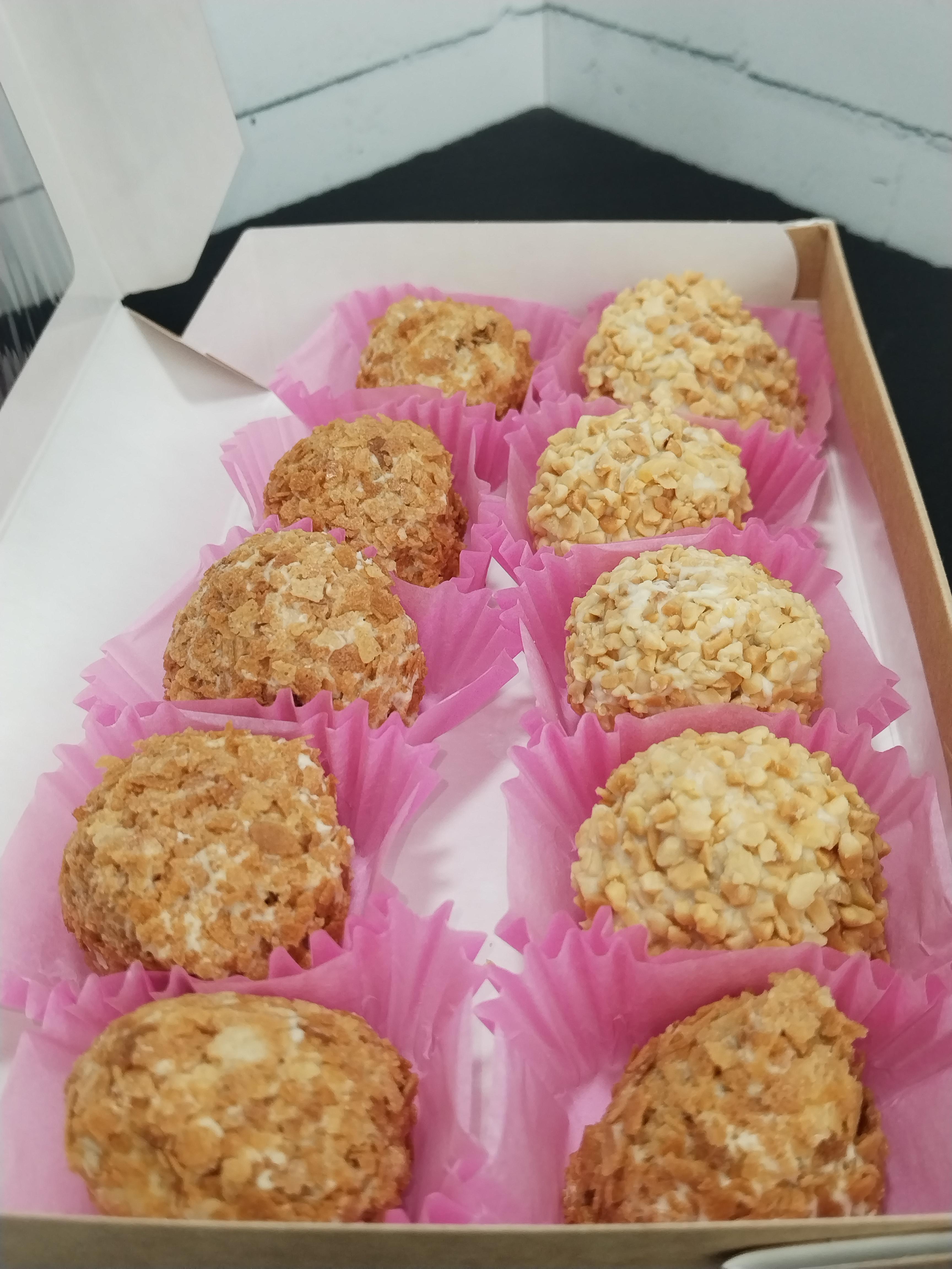 Трюфели из ганаша на молочном шоколаде, сливках 35%, сливочном масле, в корпусе из белого шоколада в обсыпке из арахиса и вафельной крошке. Вес 380 грамм